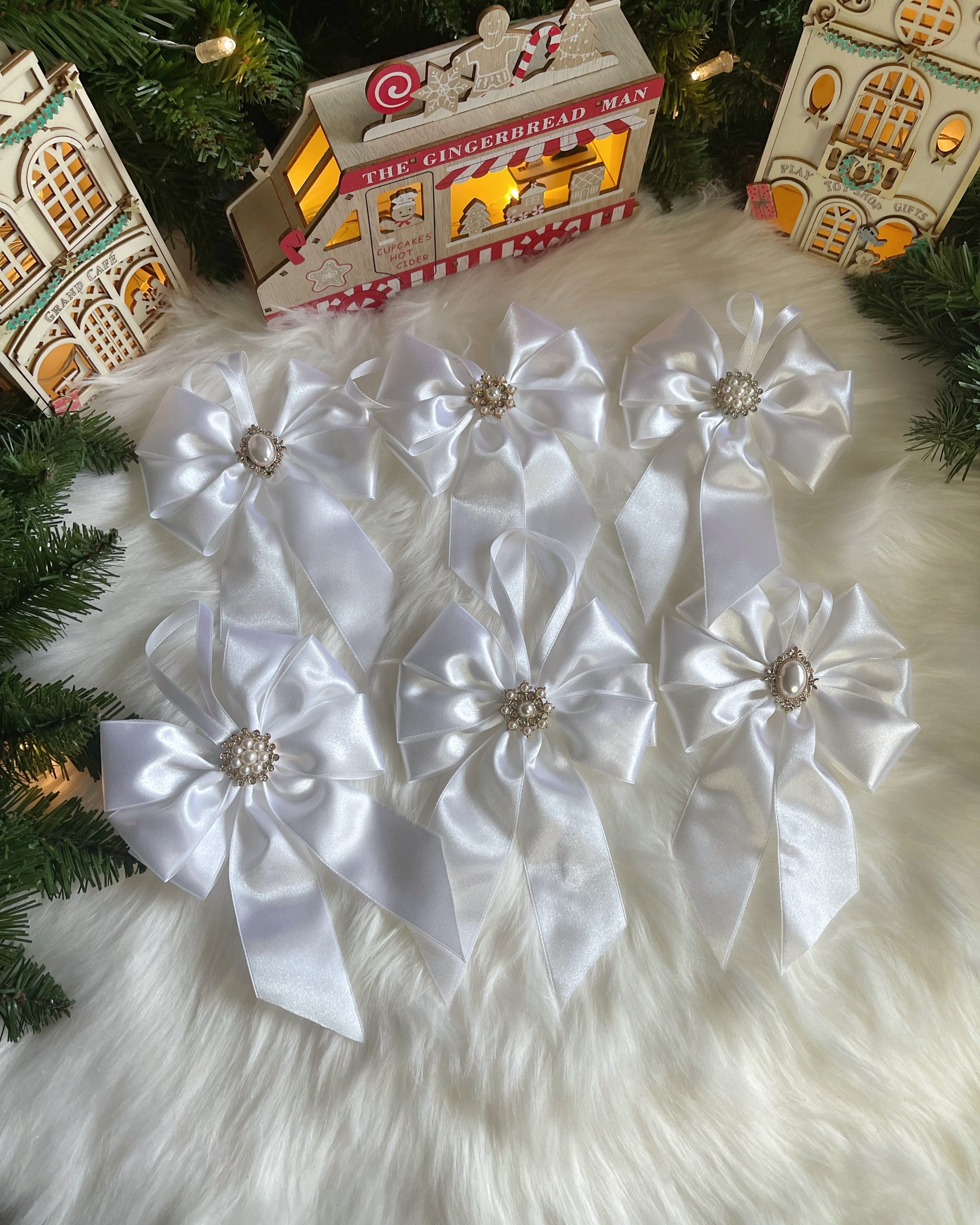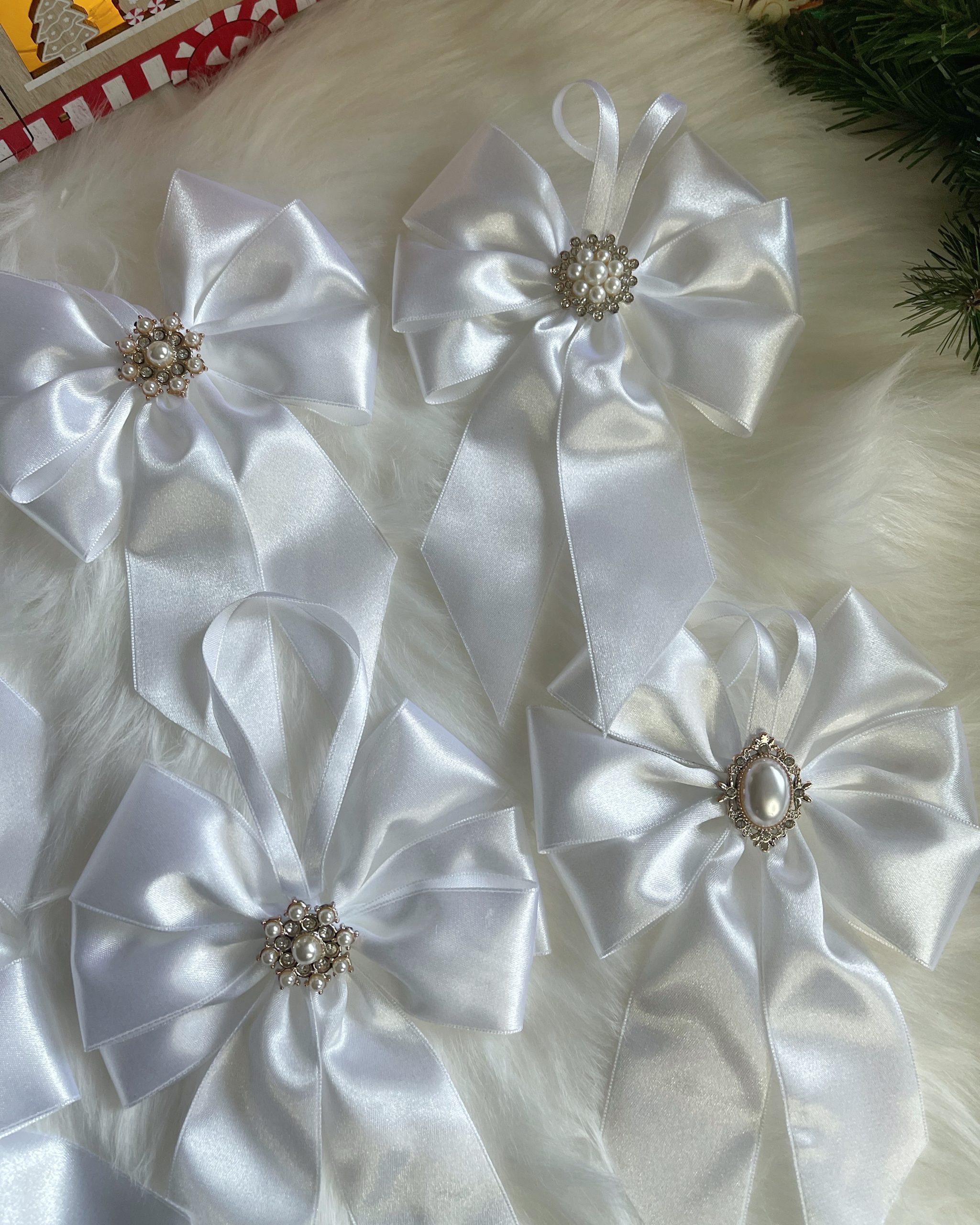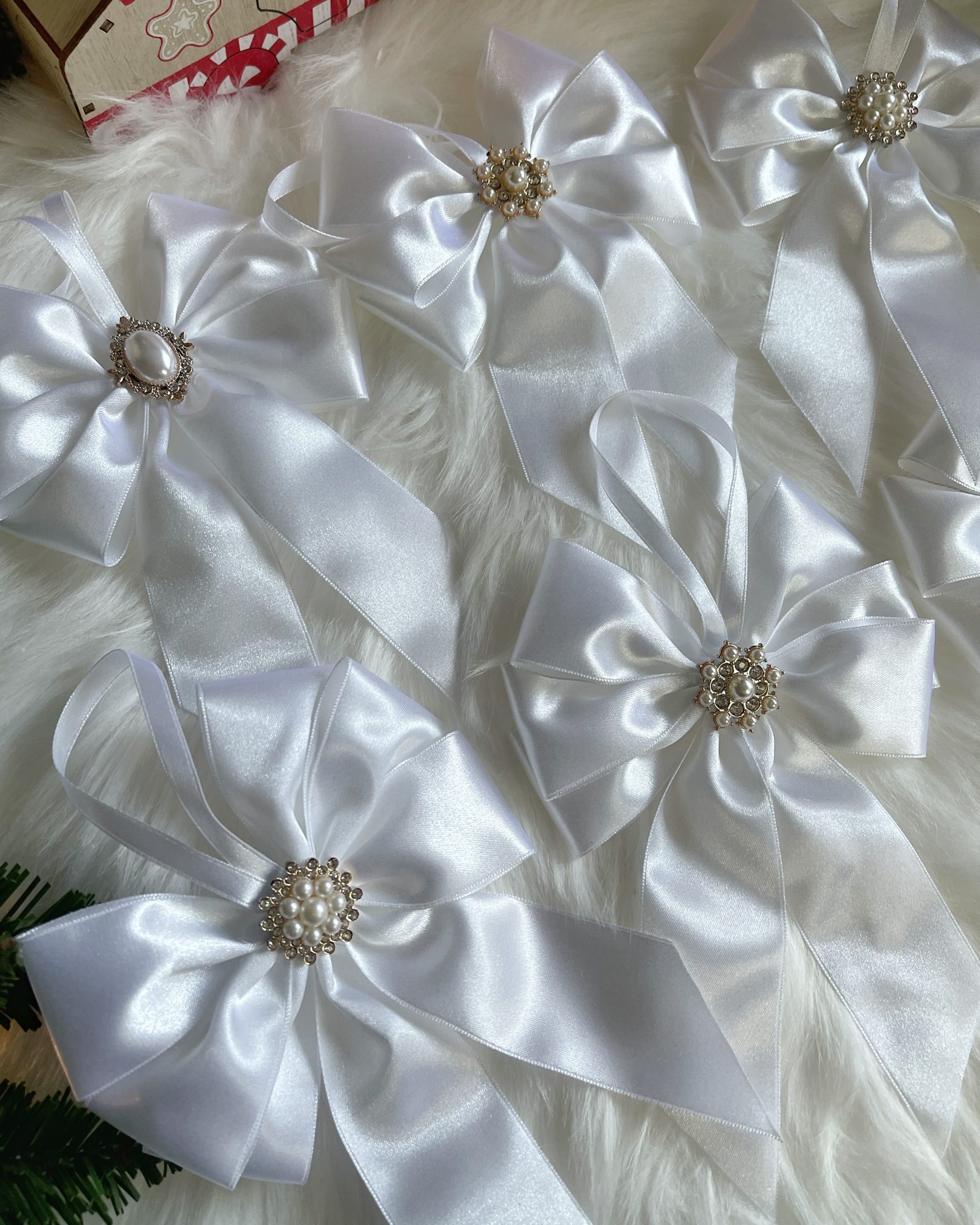 Atlasiniai baltos spalvos rankų darbo kaspinai.