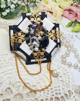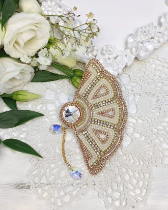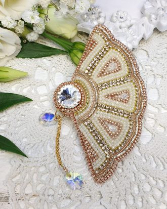 Medžiagos: Swarovski perlai, kristalų juosta, prancūziška vielutė, Premium klasės metaliniai elementai, čekiškas biseris, oda.